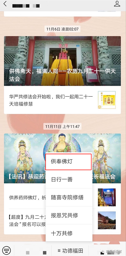 寺院捐贈系統(tǒng)中的供燈祈福模塊讓信眾通過微信公眾號、APP或觸摸屏、現場掃碼線上線下按天、按月、按年付費供燈,直播查看祈福信息。